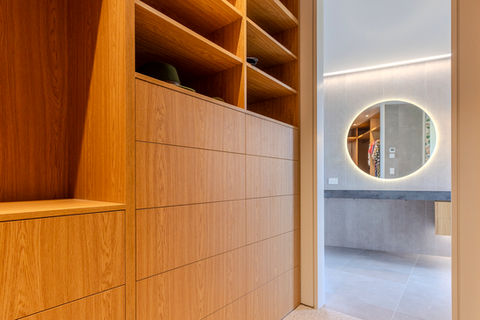 We built shelving that hugged natural stonework, added warmth and texture with Natural Oak Veneer Prefinished panels from Vidaspace, and created multiple vanities, floor-to-ceiling wardrobes, custom entertainment units, and intricate negative detail door frames, all delivered with a commitment to timeless quality.
